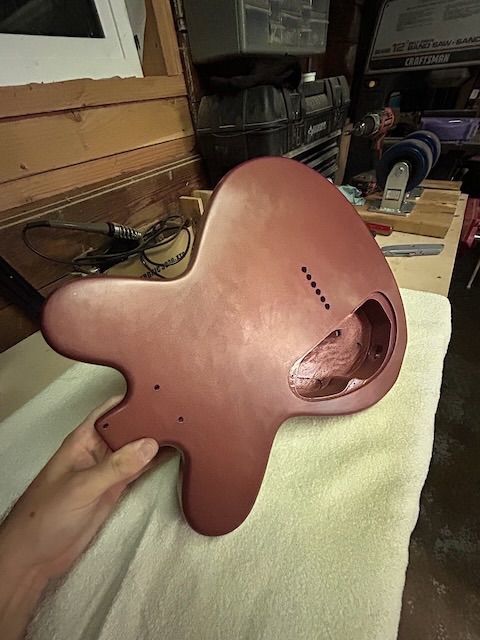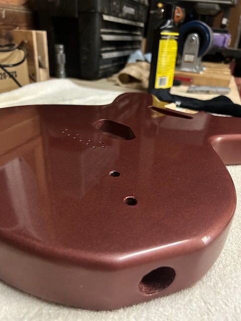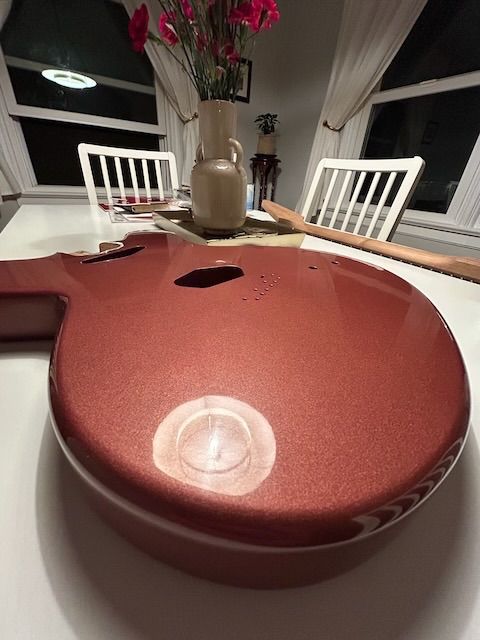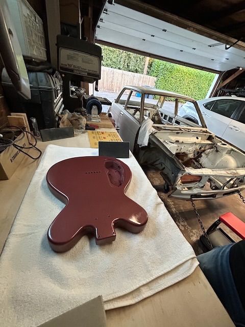 Hey dudes, not much to update on the 510 project. I did a little pulling last week, and my conclusion is that the metal is just really stubborn. I need to remove some panels to get leverage on the pieces that I want to straighten out. My other excuse on no progress is I'm trying to finish another project. I'm making a guitar for a friend and put some lacquer on the body this week. This is the wet sanding. Color coat was 2K acrylic lacquer from Industrial Finishes in Eugene. Custom color. Two cans of clear gloss nitrocellulose lacquer on top of the color coat. And polished with Meguiar's Ultimate Compound. Time to fab up some plastics, wire it up and finish the build. Then I'll have more 510 time.1 point