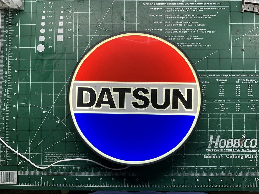 Finally got my printer upgrades sorted out. Designed and built a couple lightbox signs. Video assembling the Datsun sign -