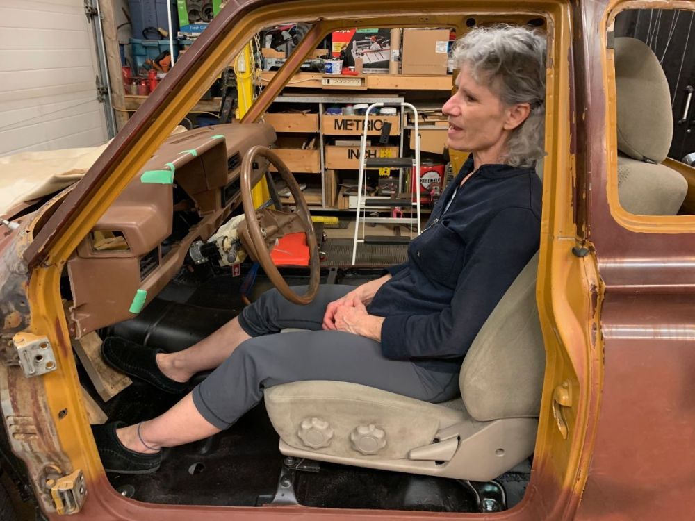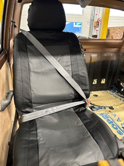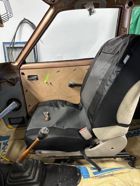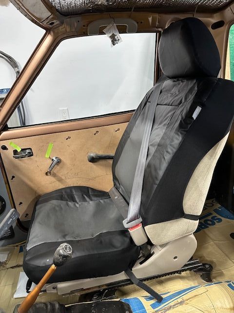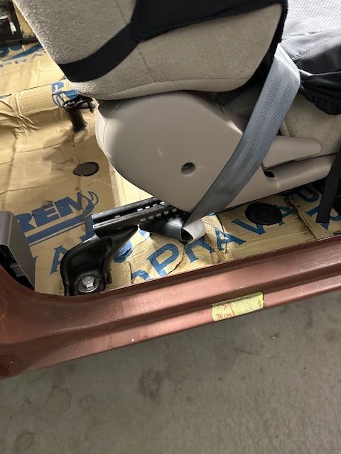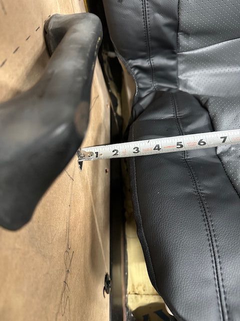 Did some work relating to the door cards & seats, needing to check fit before I end up with a problem. My seats are from a 2001 Altima and when I mounted up the sliders I didn't have the doors on plus with the idea I'm working on for the door cards meant possible interference. First thing was to eliminate the wiring under the passenger seat (occupancy sensor) which is a hydraulic thing so when I cut the hose it leaked out some viscous liquid all over the floor. With the seat installed and door pull mounted, I was able to determine my clearance to be about 2-1/2" so all is good. With the seat slid all the way fore & aft, I marked out the relative seat position on the door cards - note the door pull is partially blocked at full forward, but no-one is ever going to sit like that - and I now know exactly what limitations I have to work within for my designs. When I initially scooped these seats, I was planning on adapting the 720 dash I had (brown) so the beige seat fabric was ok. You can see that with these seats, the extra "room" of the KC is used up. That no longer provides proper feng-shui in my grey & black interior so either I need to find better fitting seat covers or possibly remove the fabric to dye them. That sounds like a lot of work though... The generic seatbelts I have do fit properly into the Nissan seat buckles so I won't have to use the floppy ends. The floor anchor ends however pose a problem. The 620 factory mounts are located behind & inside the seat rails, so either I have to run the belt under the rail as pictured or over. The other option is to relocate the anchors - not ideal. Time for some sketching to design my non-flat "non-boring" door cards...