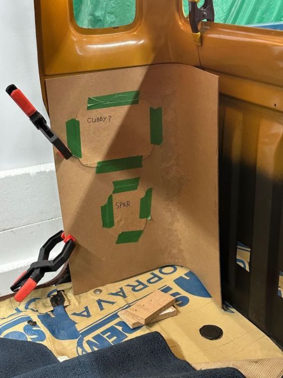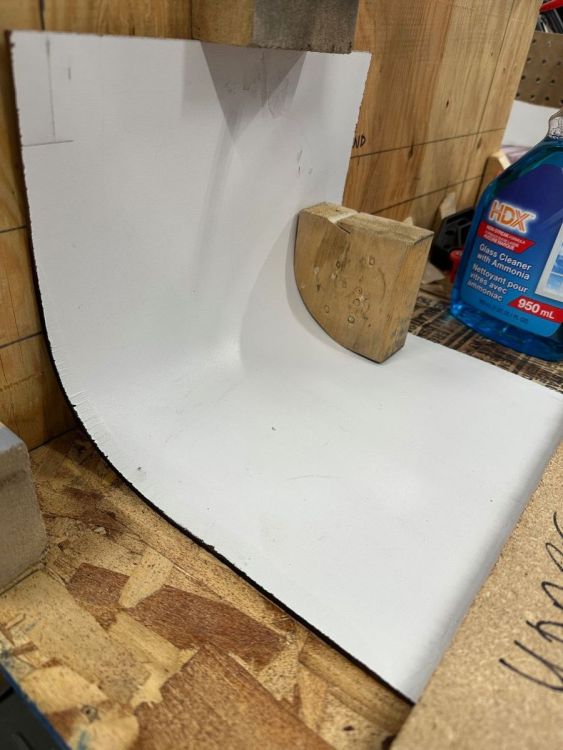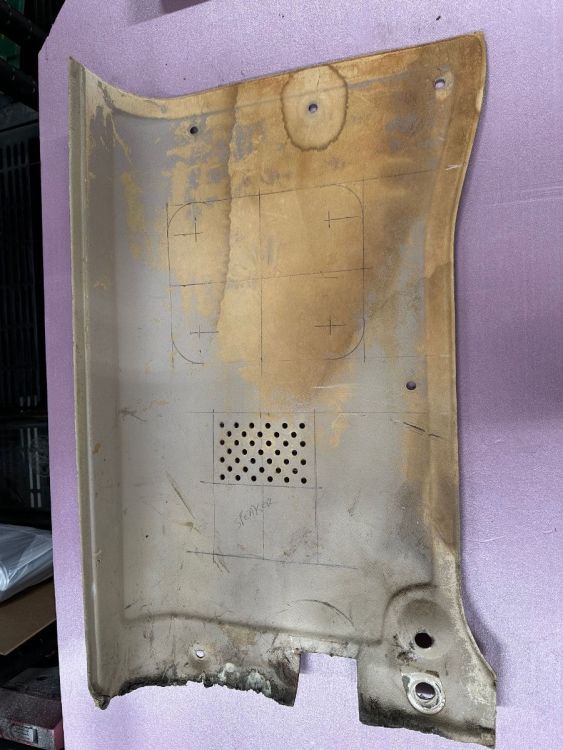 Ah yes, the Wet Coast! True the MDF/Fibreboard will behave in a Hydrophillic manner (draw in moisture), but if you give it a coating of something like Thompsons water seal, you'd eliminate that potential. Expect you wouldn't be able to apply the vinyl though afterward but maybe apply the vinyl and coat the backside (and exposed edges) with the water seal. Another idea to "build in" a pattern. Maybe I should've done this. When I remade the rear corner panels (fibreboard) I had to duplicate the curve of the original panels. The process isn't hard but use caution or the fibreboard will crack not bend. First step is a mould to replicate your shape (or embossed pattern). Best would be to have male+female mould halves so you can press the fibreboard in between. Like stamping metal. This has to be gentle and smooth but easily accomodates up to about 1/2" embossing. Lightly sand the area that needs to be curved/raised or altered. Spray (important - use Glass cleaner that has ammonia) to wet that area, then lay the fibreboard on your mould and slowly & evenly press the halves together. Allow to dry. Repeat as necessary until full shaping is acheived and fibreboard doesn't relax back to the original flat beyond what you accept. If you are too aggresive, the fibreboard with separate and crack. If that happens and isn't too bad, use wood putty and smooth it out. Here is the original curved and rotten panel My test panel with mould negative to confirm curve Curved panel ready for other work Not shown is the dimple I had to make to accomodate the bump out for the seat belt. First one I was too aggressive and it cracked alot. Next one was much better. Doing the dimple is why I think this might work for shaping a pattern into the door cards. I've already invested too much time and made my replacement cards fit exactly, but maybe one of you guys would do it.