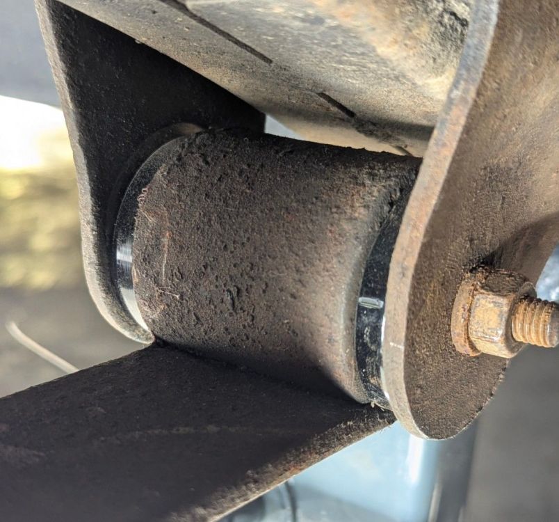 They showed up this morning and fit perfectly. In usual 1200 fashion it took about 30 minutes to pop the shackles off and get it all back together. You can see the rub mark from how far offset the old bushing was sitting. No idea how they ride yet but the holes are the right shape. Test fit on the springs I'm cleaning up. Yikes for comparison -