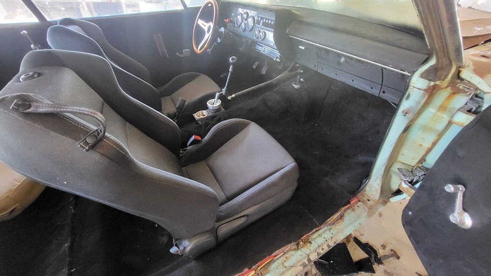 datsunfreak Posted February 23 Author Report Share Posted February 23 (edited) Driver's side panel finished and installed... Rear panels riveted together... Right side wrapped and installed... Left side wrapped and installed... At this point it was time for carpet, but we still needed to make one more thing. Got that thing done... Then put down a layer of sound/heat insulation (no pic), and finished laying the carpet... It's done in two pieces, one from the rear floor to just in front of the shifter/seat (glued down), then a front piece that overlaps by about 6" (not glued down). It comes up to the front edge of the seat/shifter, so shouldn't be too visible once the seats are installed. He is going to order some repro door sill plates and that should finish it off. Last thing I did was one more little finishing touch. I could not find the little bracket that holds the visors on in the center, and while I was cleaning out the car to do the carpet, it magically turned up! So I got it screwed on, scrubbed down the visors, and put a bit of paint on them, They were originally a teal color, which wasn't going to work in this all black interior... Edited February 23 by datsunfreak 5 Quote Link to comment