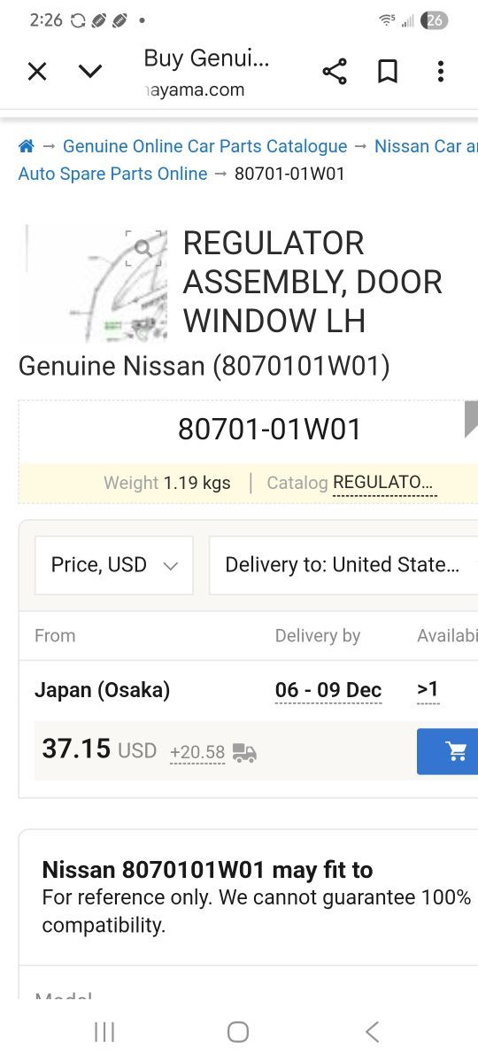 Thomas Perkins Posted November 27 Author Report Share Posted November 27 I just checked my email and the over seas company Amayama sent a email saying the Nissan left side window regulator is available.They jacked the shipping from 20.58 to 86.56 and duties fees from 20.58 to 15.06.Part was 37.15.Now it is 34.84 for a total of 136.46.First total was 78.23. Is 58.23 more.The new after market one on Ebay that is from Thailand is 75.76 total.A difference of 60.70.About a tank and half of gas.Gas is 2.49 a gallon here.So what should I do.If I get the after market one and it dont fit.I will be stuck paying for shipping it back.They said it will be here December 13.Has anyone bought from Amayama.I read there reviews and they are good. Quote Link to comment